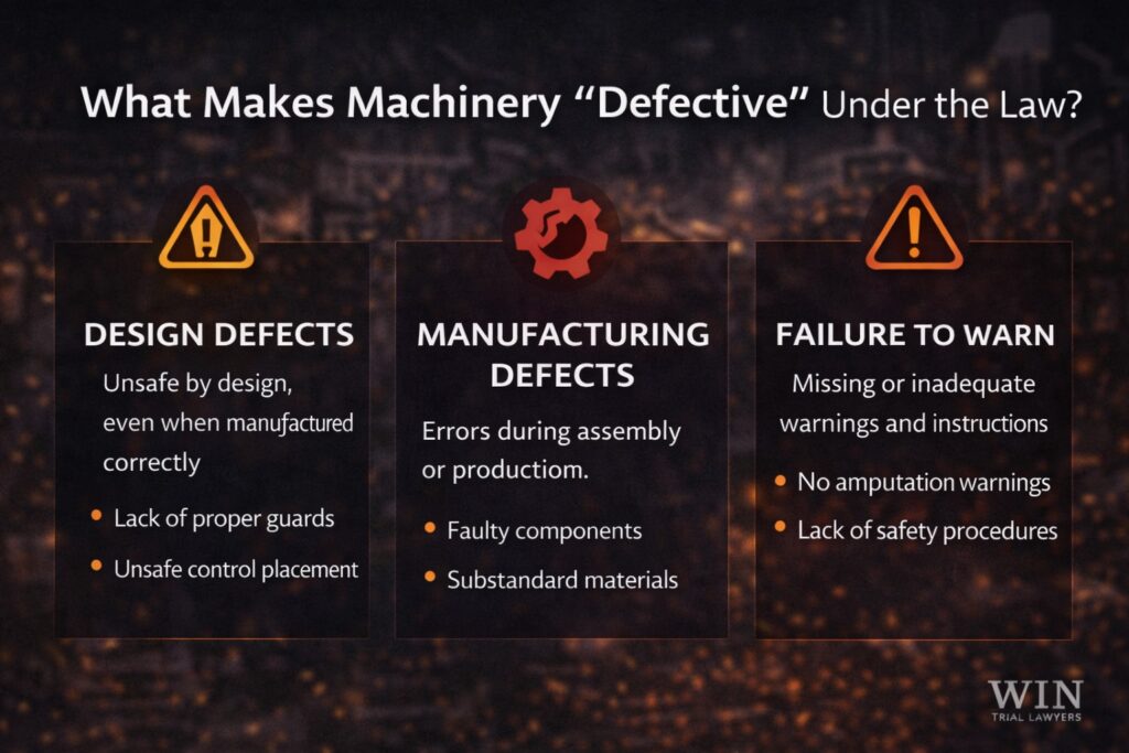 A machine may be considered legally defective when it is unreasonably dangerous and causes injury during foreseeable use. In amputation cases, defects often fall into one or more of the following categories.
