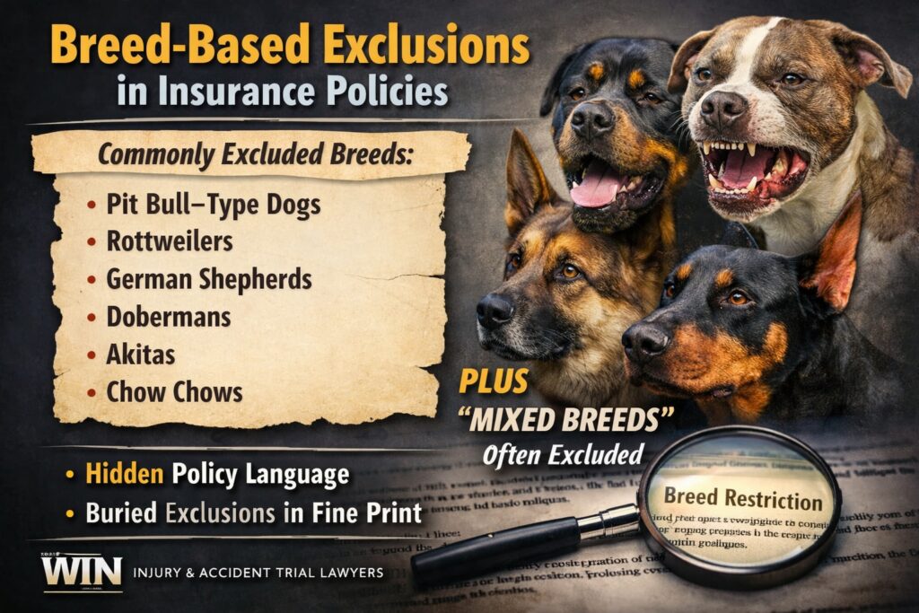 Many insurance policies contain breed-based exclusions or restrictions that limit or eliminate coverage for injuries caused by certain dogs. These exclusions are frequently buried deep within policy language, endorsements, or underwriting guidelines that policyholders rarely read or fully understand.
