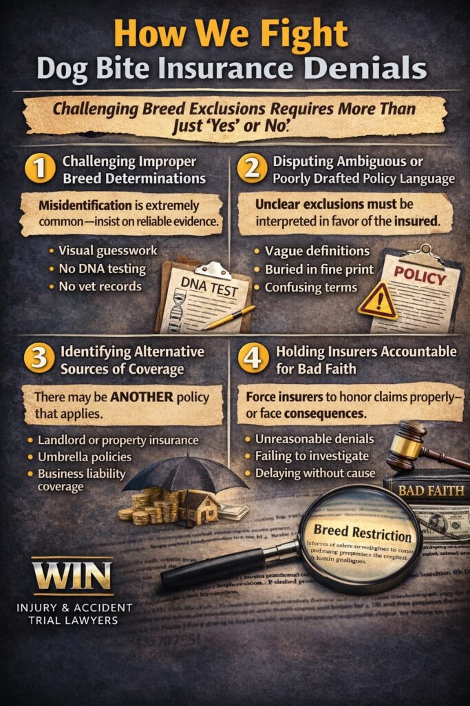 At WIN Injury & Accident Trial Lawyers, we routinely handle dog bite cases where liability is clear and undisputed, yet the insurance company still refuses to pay fair compensation. Why? Because insurers frequently rely on breed exclusions or restrictive policy language buried deep within homeowners’ or renters’ insurance policies. These exclusions are often unknown to the dog owner—and completely unexpected by the injured victim—until after a serious injury occurs.