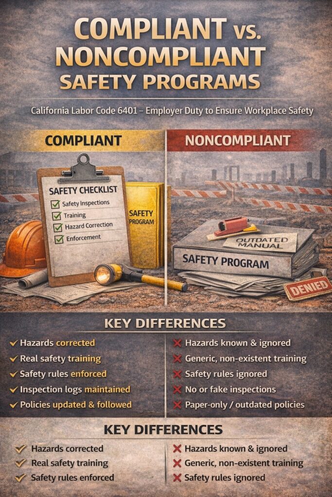 Labor Code 6401 works alongside Cal/OSHA regulations. OSHA violations can be powerful evidence that an employer failed to maintain a lawful safety program.