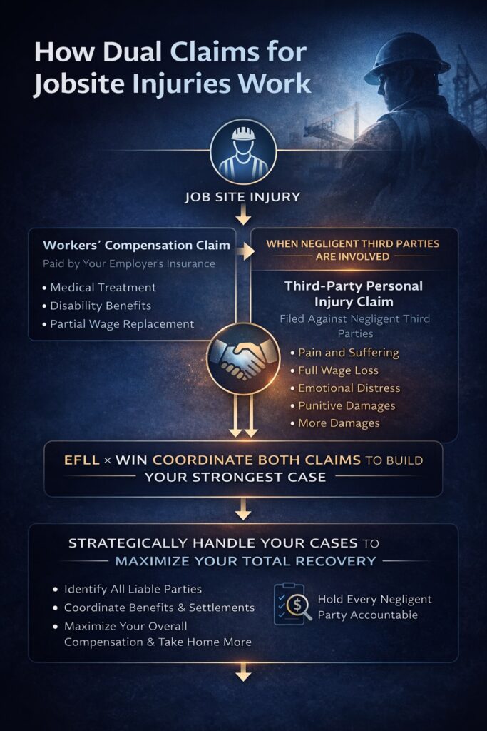 If you were hurt on a construction site, you may qualify for both a workers’ compensation claim and a personal injury (third-party) claim—two distinct legal paths designed to address different types of losses. When pursued strategically and in coordination, these dual claims can dramatically increase the total compensation available to you, far beyond what workers’ compensation alone provides.