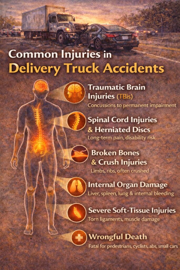 Due to the force and mechanics involved, delivery truck accidents often result in severe or life-altering injuries. Common injuries include: