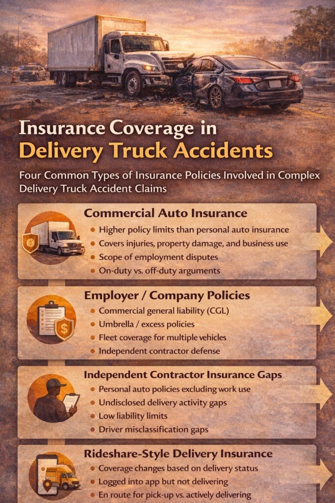 Delivery truck cases often involve several insurers arguing over who is responsible. While insurers dispute coverage, injured victims can face delays—making early legal intervention critical to force coordination and disclosure.