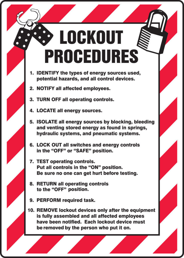 - Required lockout/tagout procedures, including when lockout is mandatory versus optional