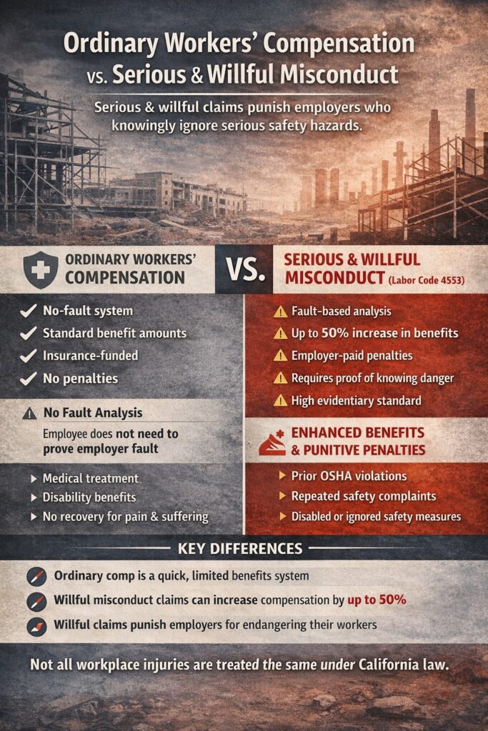 California Labor Code 4553 allows an injured worker to receive increased workers’ compensation benefits when the employer’s conduct rises to the level of serious and willful misconduct.