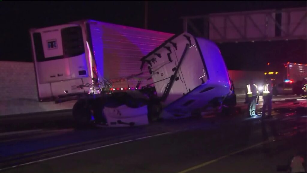 A serious freeway collision involving a big rig and a passenger vehicle shut down lanes on the westbound 210 Freeway in San Dimas, sending one person to the hospital and causing significant traffic disruptions during the morning commute, according to local reports.