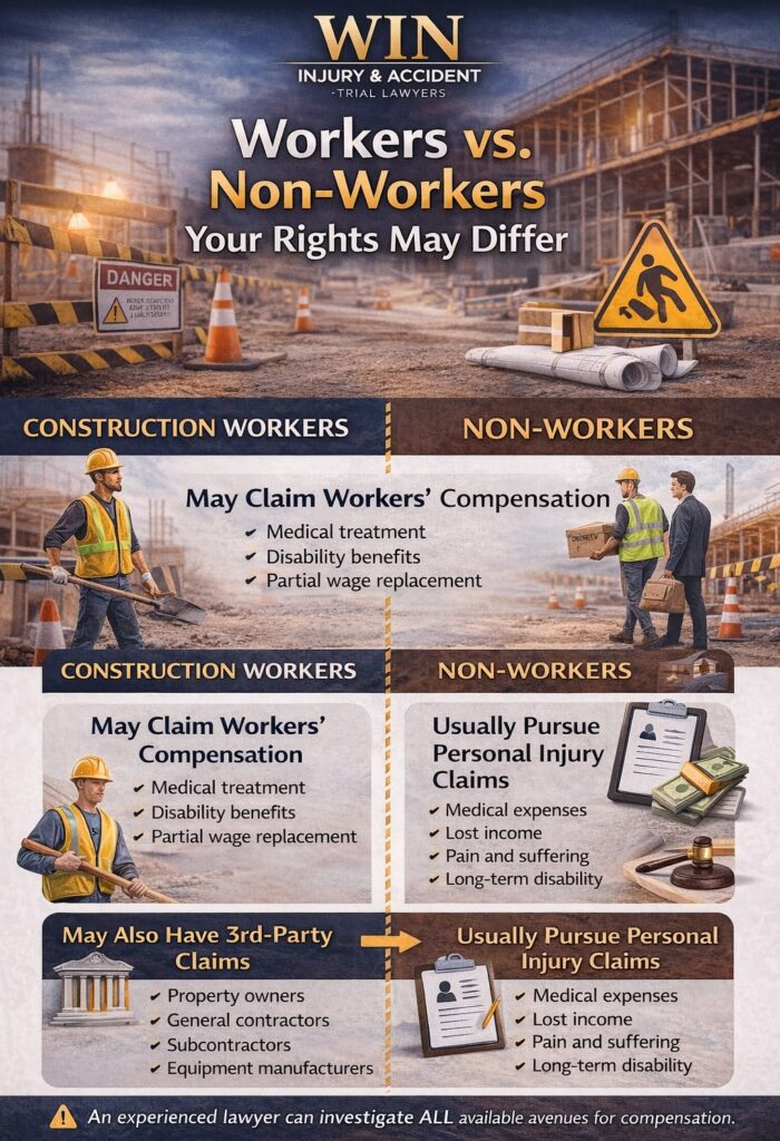 A worker is someone injured while performing job duties at the construction site (such as a laborer, electrician, or subcontractor). A non-worker includes pedestrians, visitors, delivery drivers, tenants, or passersby who are not employed on the site.