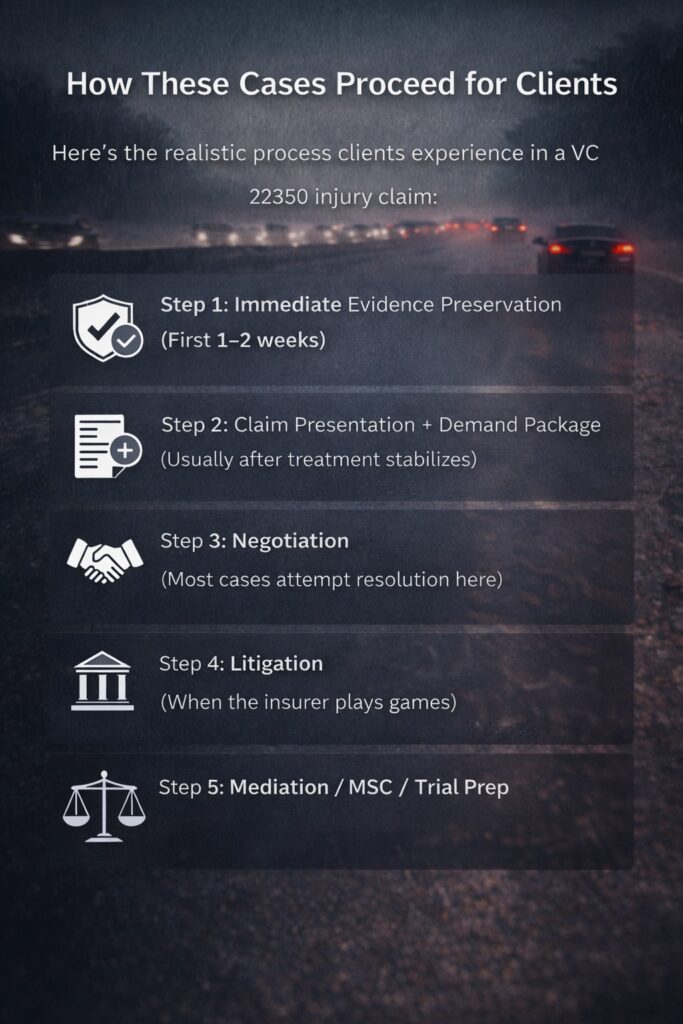 Here’s the realistic process clients experience in a VC § 21804 injury claim: