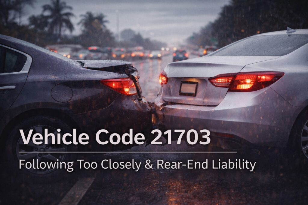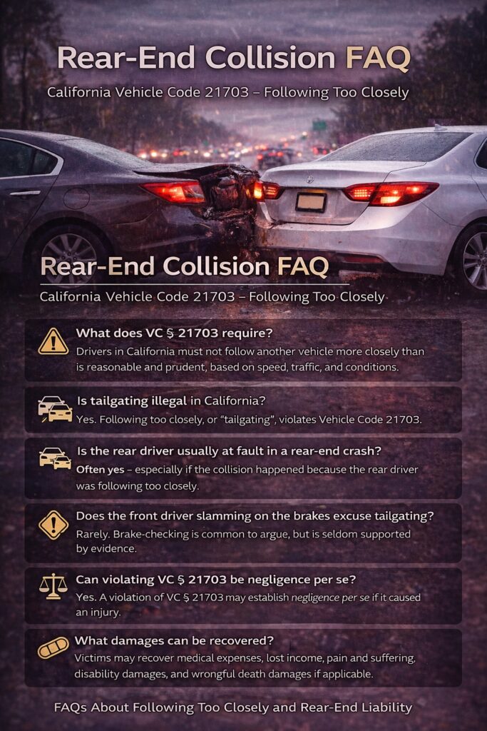VC § 21703 exists to prevent rear-end collisions and protect drivers, passengers, and pedestrians. When a driver follows too closely and causes a crash, these elements are often satisfied.