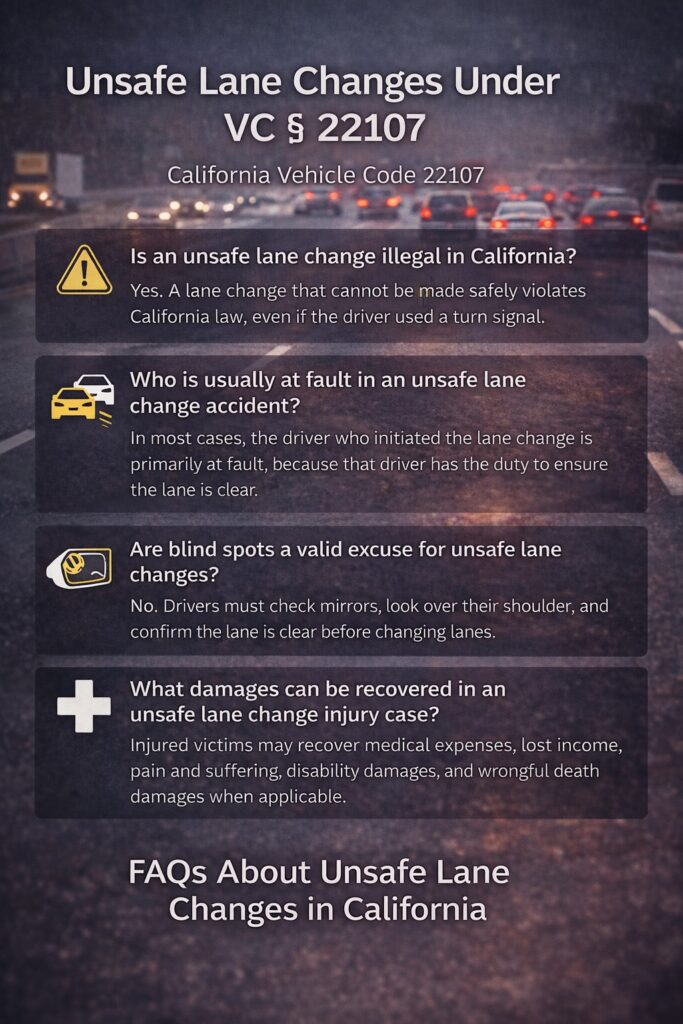 Unsafe lane changes are a leading cause of freeway and roadway collisions in California. They happen in seconds, often without warning, and frequently leave injured drivers, motorcyclists, and passengers facing serious injuries — while insurance companies argue over who “came out of nowhere.”