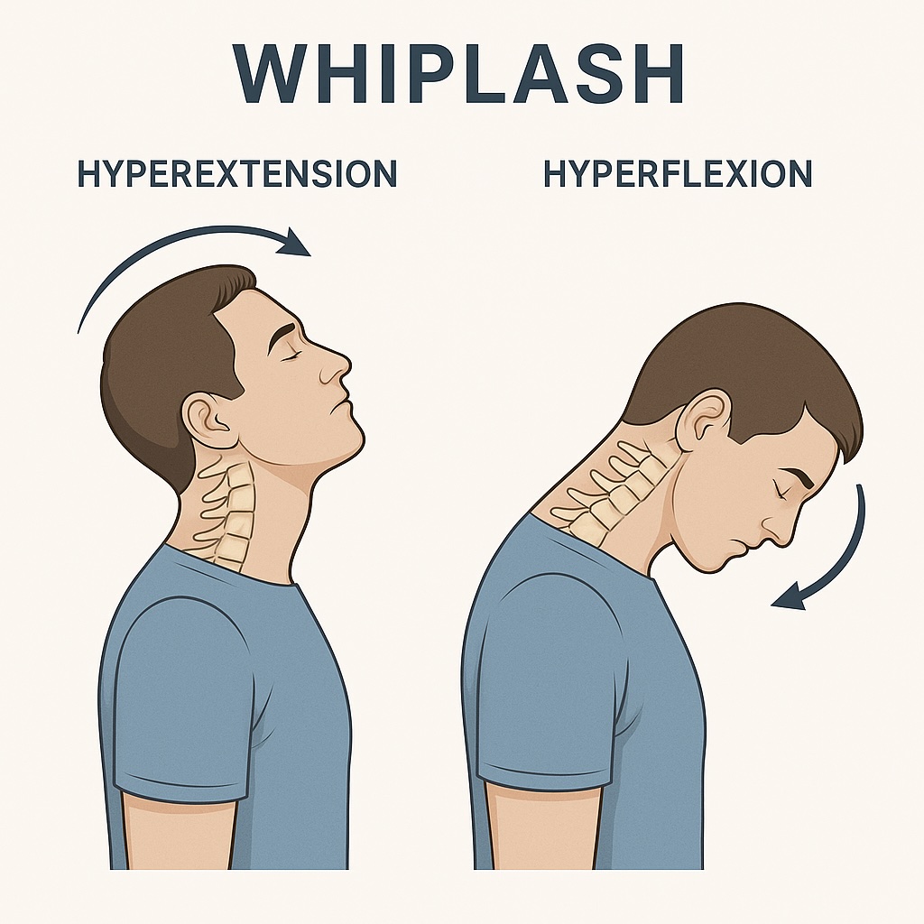 During a rear-end or sudden-impact collision, the body is pushed forward while the head momentarily lags behind. This creates a rapid “S-curve” motion through the cervical spine. In the first phase, the neck goes into hyperextension as the head snaps backward; fractions of a second later, the head rebounds forward into hyperflexion.